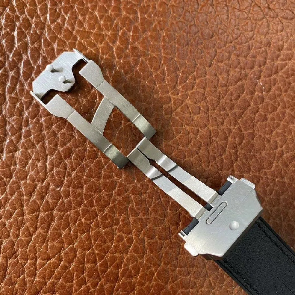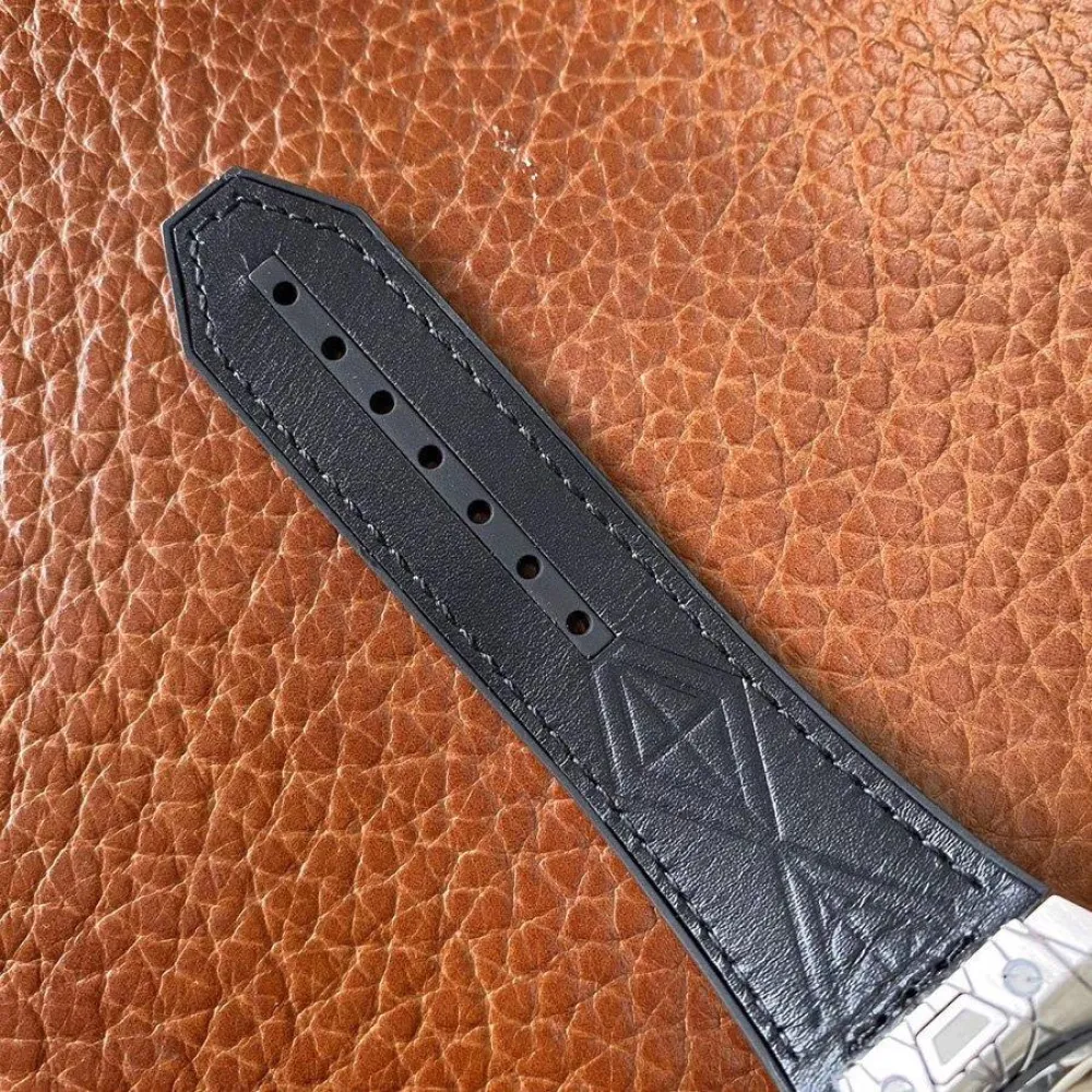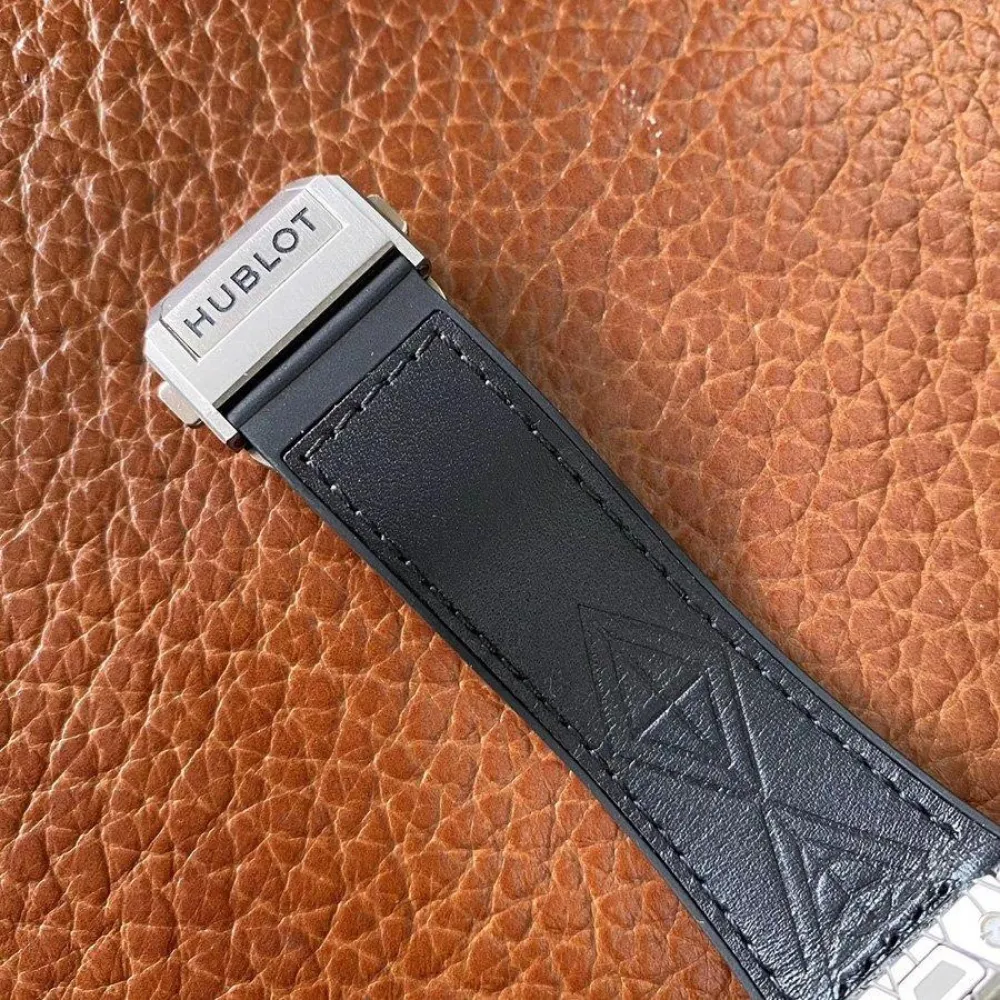 Черный кожаный ремешок, с двойной раскладывающейся стальной застежкой Hublot. Система быстрой смены ремешка при помощи пушеров на корпусе часов.